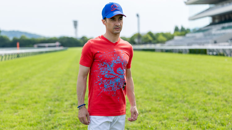 Made in Japan 100% cotton V-neck short-sleeve T-shirt, inspired by the colors and motifs of horse racing.