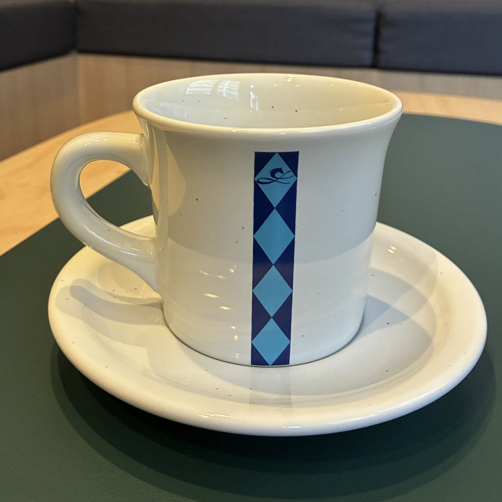 カップには、ルメール騎手がNAR(地方競馬)で騎乗する際の勝負服デザインをモチーフにしたブルーダイヤモンドパターンがあしらわれています。この勝負服は、京都のCLブティック内にある「Jockey Room」にも展示されており、ブランドを象徴するデザインとしていくつかのコレクションにも取り入れられています。